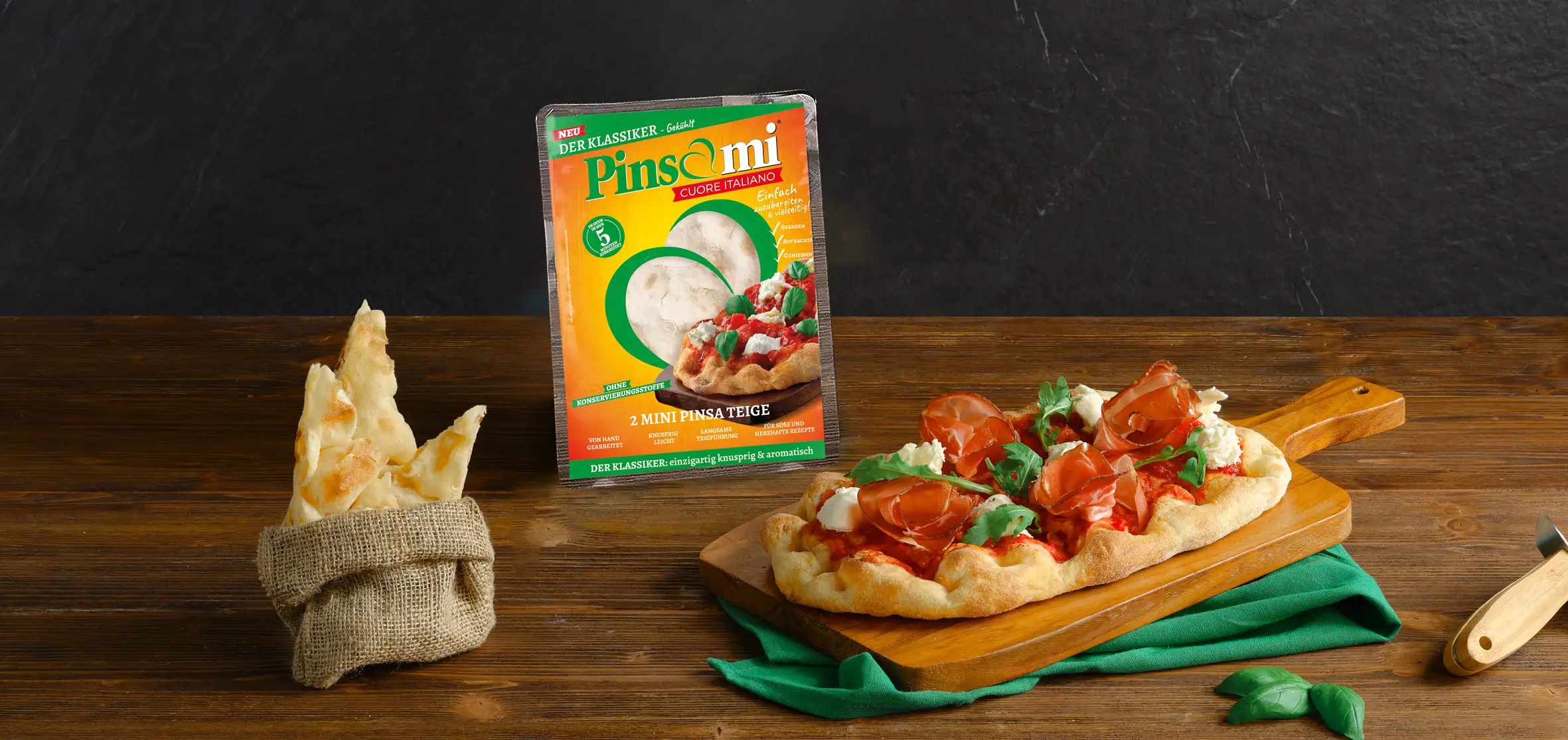 Pinsami Gekühlte Linie ist das erste Produkt von Pinsami. Geeignet für jede Art von Rezept, vom einfachsten bis zum raffiniertesten, ist es Ihr perfekter Partner in der Küche, denn in nur 5 Minuten können Sie leckere und einzigartige Gerichte zubereiten. Pinsami ist ohne Konservierungsmittel und völlig vegan und hat alle einzigartigen Eigenschaften von Pinsa: knusprig, bekömmlich und lecker.
