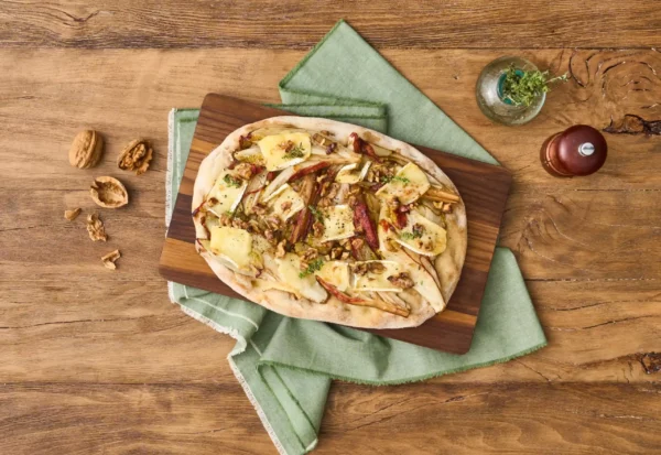 3) Auf der Pinsa anrichten und in Scheiben geschnittenen Brie, gehackte Walnüsse und etwas Olivenöl hinzufügen. Im vorgeheizten Umluftofen bei 250 °C 6 Minuten backen.