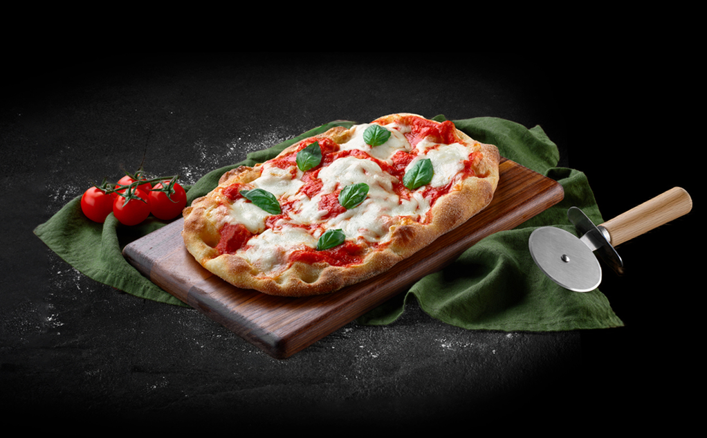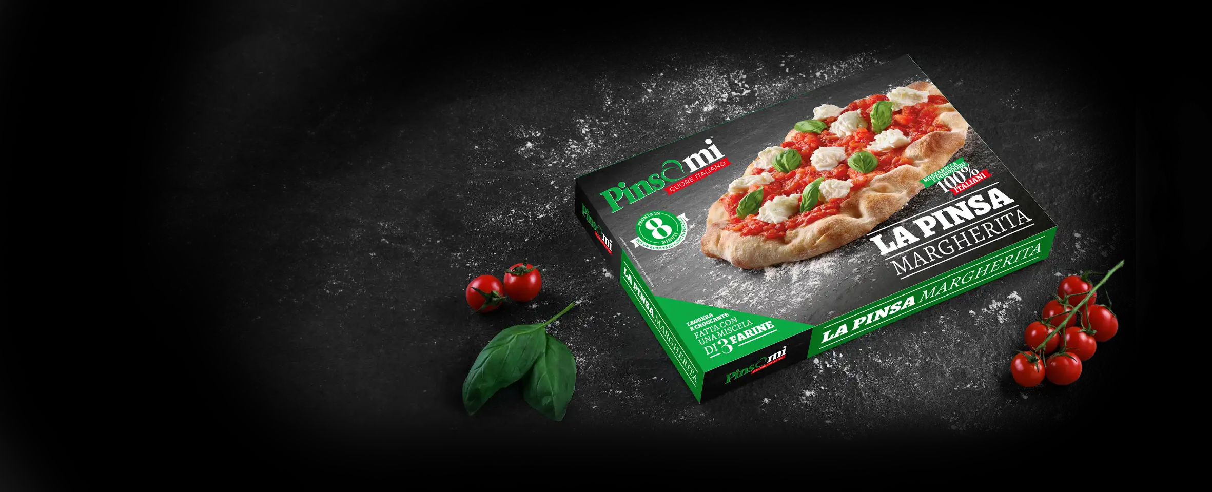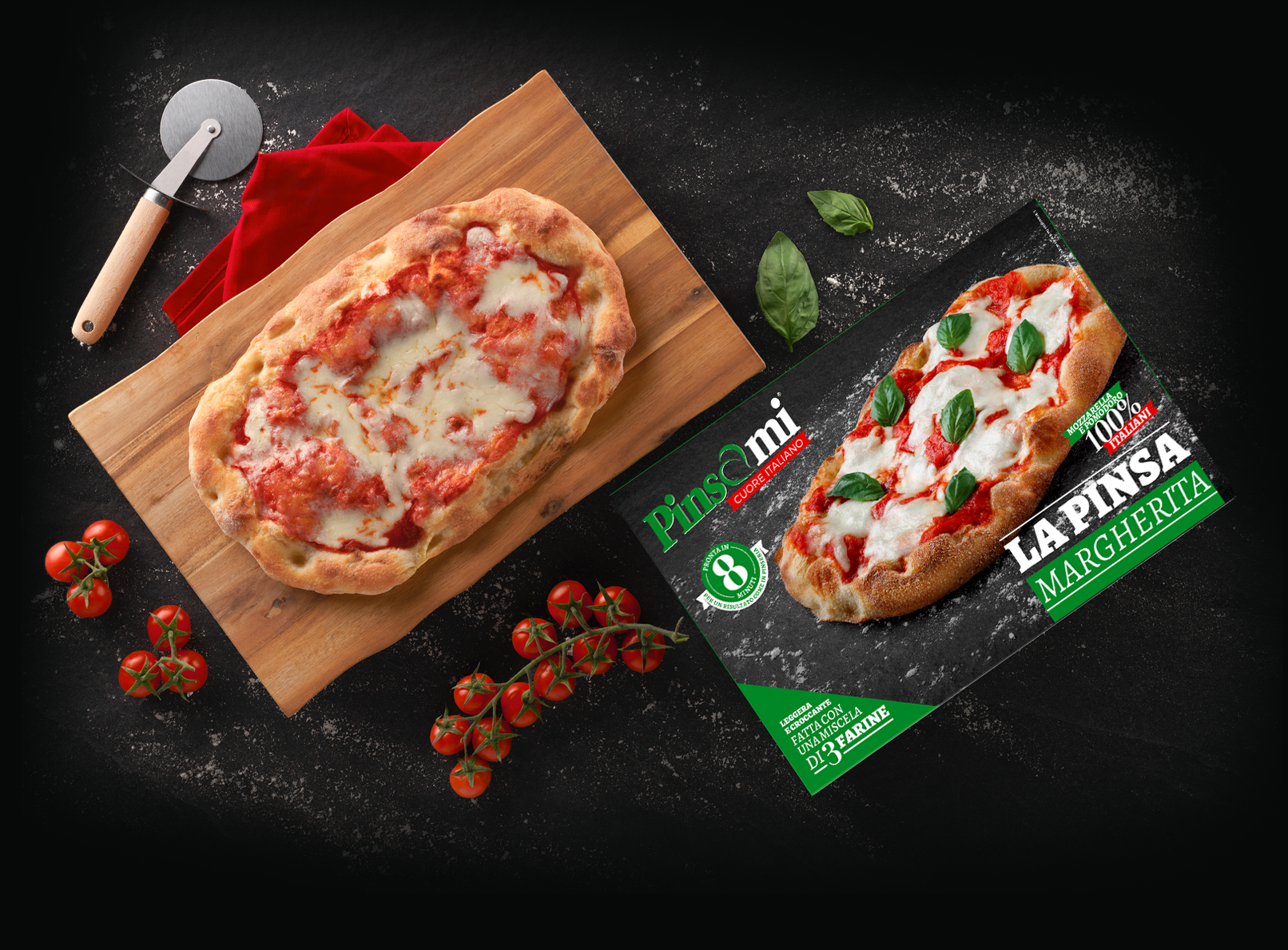 La pinsa Margherita è preparata con un mix di tre farine, lunga lievitazione ed alta idratazione per un impasto super digeribile, croccante all’esterno e morbido all’interno, ora arricchito da una gustosa salsa di pomodoro e una filante mozzarella, 100% italiani!