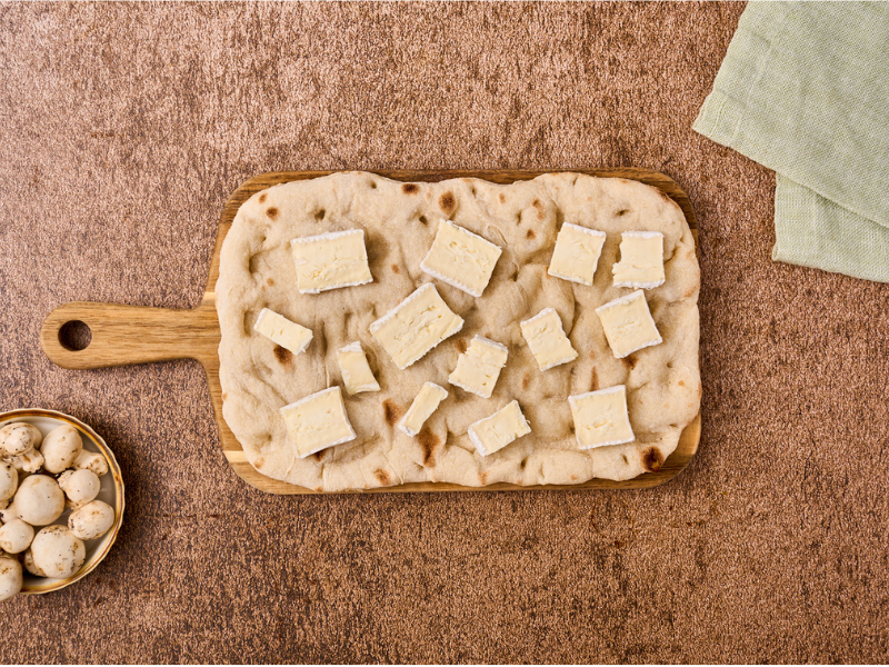 Disponi i pezzetti di brie sulla base pinsa e cuoci in forno preriscaldato per 5-6 minuti, finché il formaggio si scioglie e la pinsa diventa dorata e fragrante.