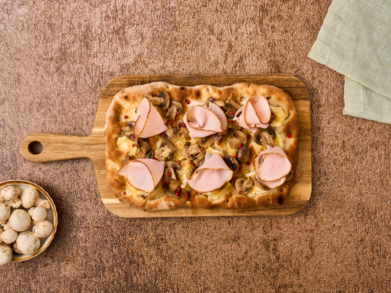 La Pinsa con arrosto di tacchino, brie e funghi trifolati è il “comfort food” per eccellenza rivisitato in chiave gourmet. In questa ricetta, la delicatezza del tacchino si sposa con i funghi, mentre il brie fuso lega il tutto con la sua irresistibile cremosità. Un connubio che profuma di bosco e di tavole imbandite, ideale per una cena delle feste.