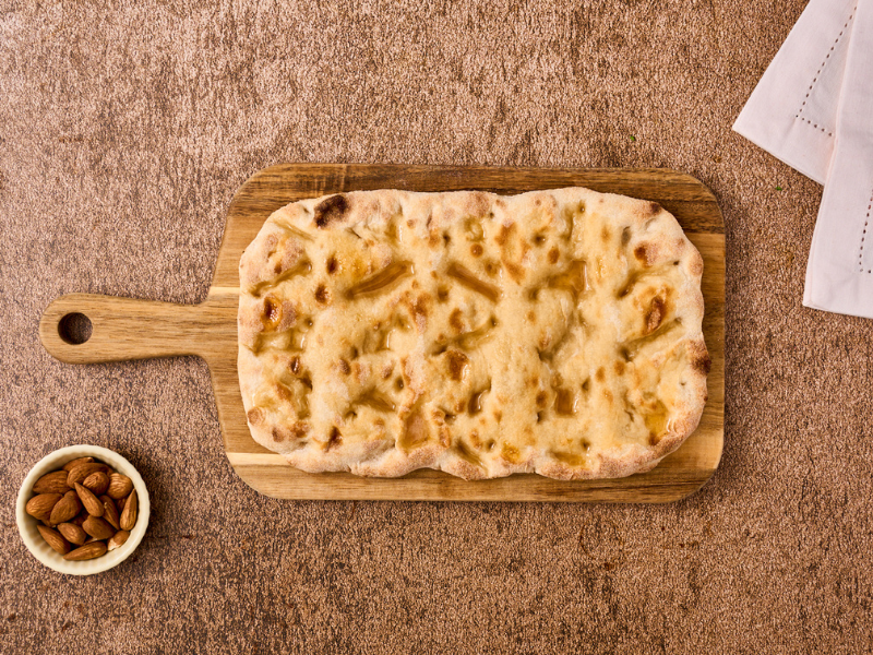 Completa la ricetta con un filo di miele e servi la pinsa dolce tiepida o a temperatura ambiente.