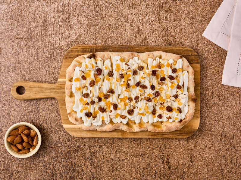 Ecco pronta una deliziosa pinsa con crema di ricotta, meiele e frutta candita, perfetta da gustare nelle giornate invernali.