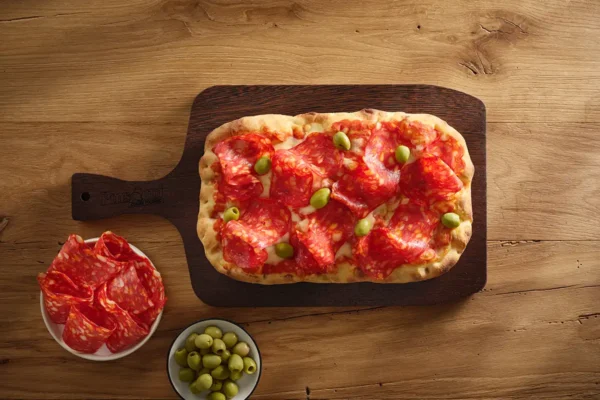 - Cottura in forno: prendi la base pinsa Pinsami e condisci con una goccia di olio. Inforna in forno ventilato preriscaldato per 5 minuti.