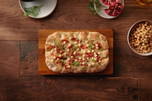 Pinsa con babaganoush, ceci croccanti, melograno e aneto