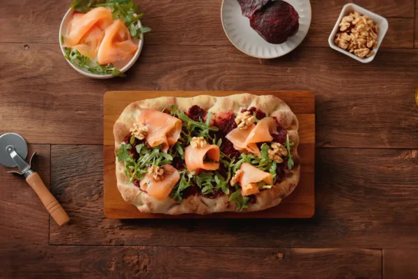 Pinsa con crema di barbabietola rossa, salmone, rucola e noci